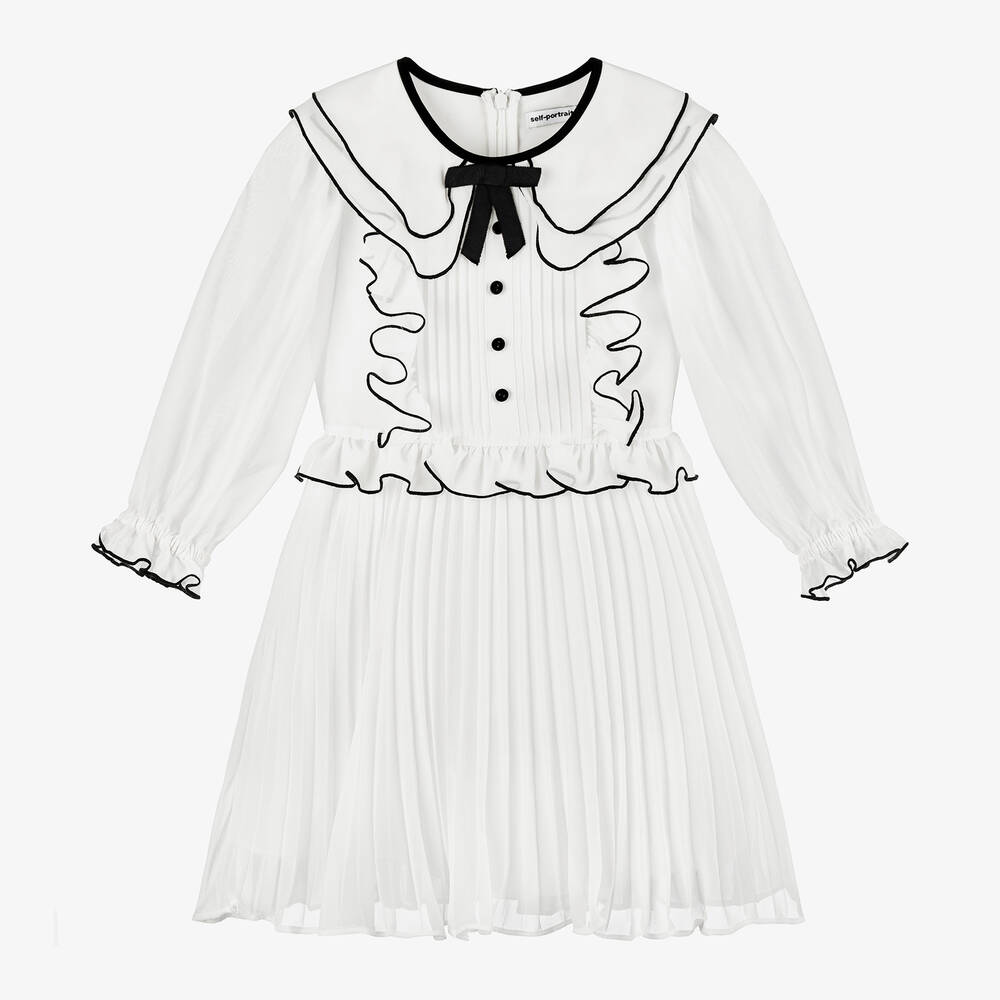 A white crêpe chiffon dress for girls from Self-Portrait, with black trims and an elegant pleated skirt. Styled with sheer long sleeves and ruffle trims, it features a decorative black grosgrain bow and buttons on the bodice for a classic, timeless look. Fastening with a concealed zip on the back, this stylish dress has a silky, lightweight lining for comfort.