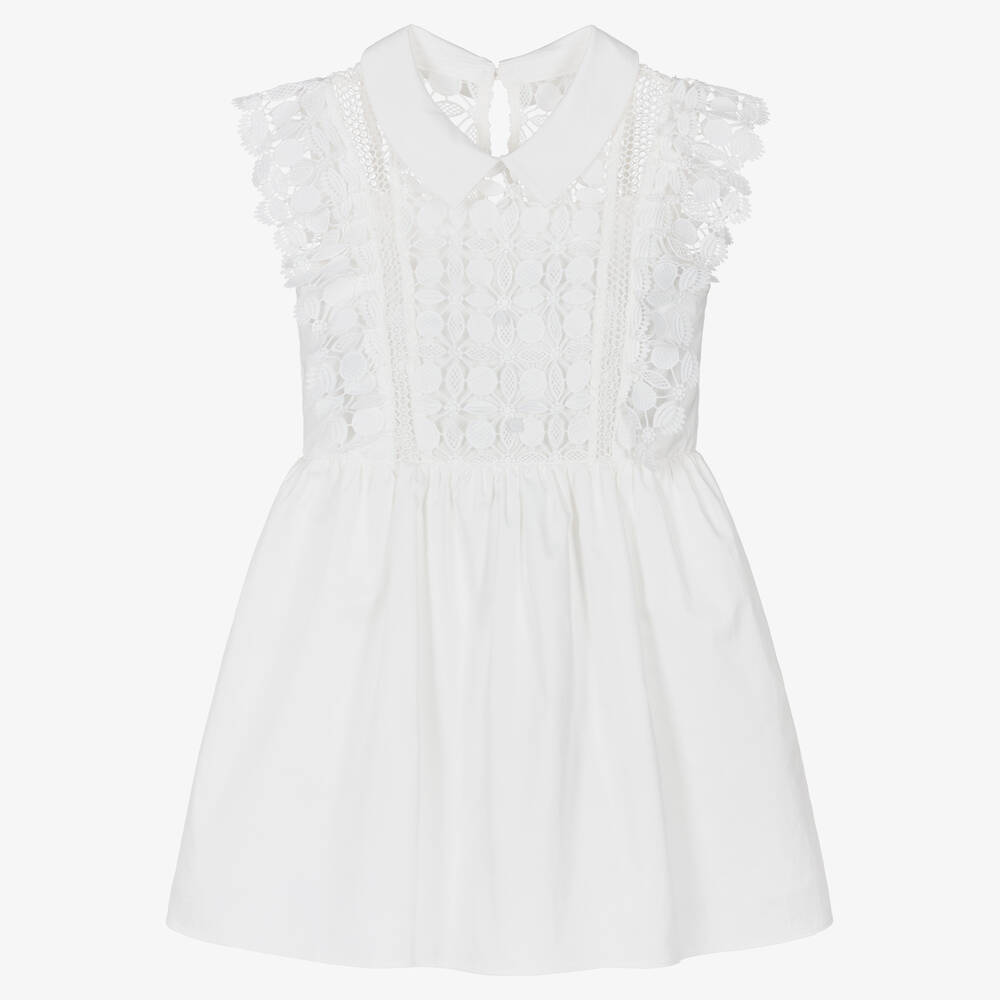 White cotton and lace dress for girls by Self Portrait, a London-based designer. With beautiful cutwork lace on the bodice and a smart pointed collar, this pretty design has a flared A-line skirt and useful side seam pockets. The dress is fully lined in smooth cotton and fastens on the back with a concealed zip.