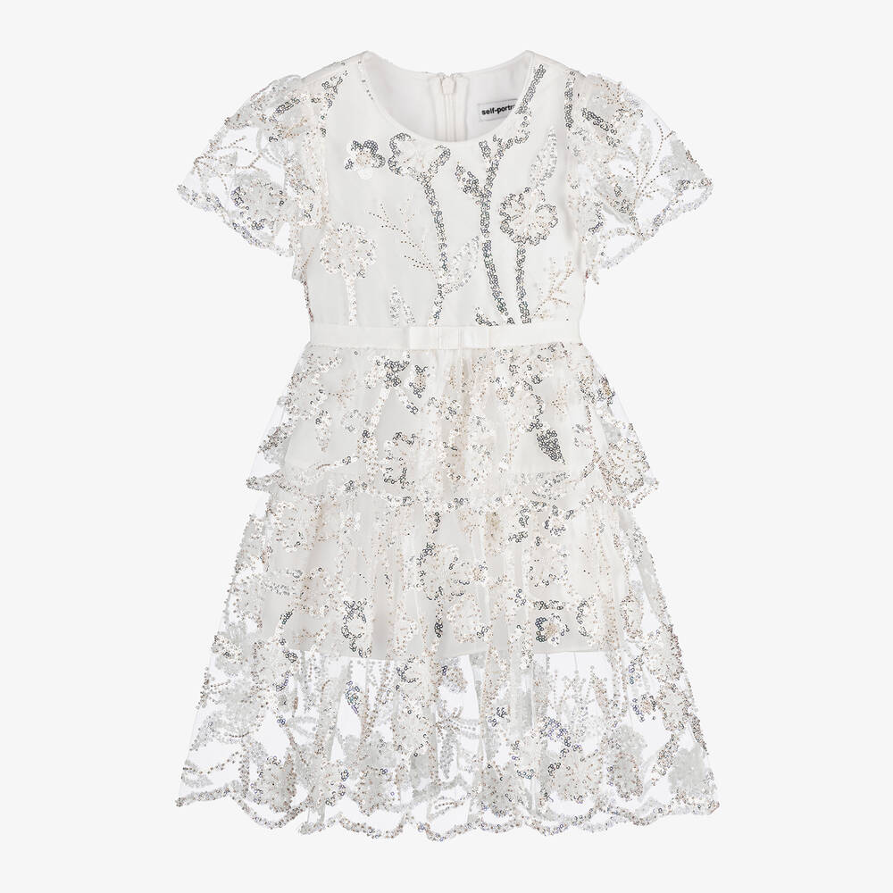 A stunning white special occasion dress for girls by Self-Portrait, made from fine tulle embellished with pearl beads and sparkling silver sequins. This beautiful design features semi-sheer short sleeves and scalloped trims, a pretty bow on the waist and a layered skirt. The silky lining adds comfort and modesty, and it fastens neatly on the back with a concealed zip.