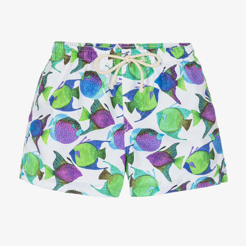 Boys white, green and blue swim shorts from Selini Action, with a branded pocket on the back. Soft, silky and lightweight, the woven fabric is stamped with little tropical fish. To ensure the best fit, the waist is adjustable with an ivory rope drawstring. These comfortable shorts are lined with soft and breathable cotton-blend mesh.