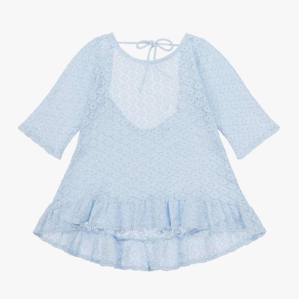 A sweet dress in pale blue for girls by Selini Action. Lovely as a cover-up on the beach or by the pool, it is handmade in luxuriously soft cotton crochet. This lovely dress has three-quarter-length sleeves, a ruffle hem for added flounce, and a tie-up detail on the stylish scooped back.