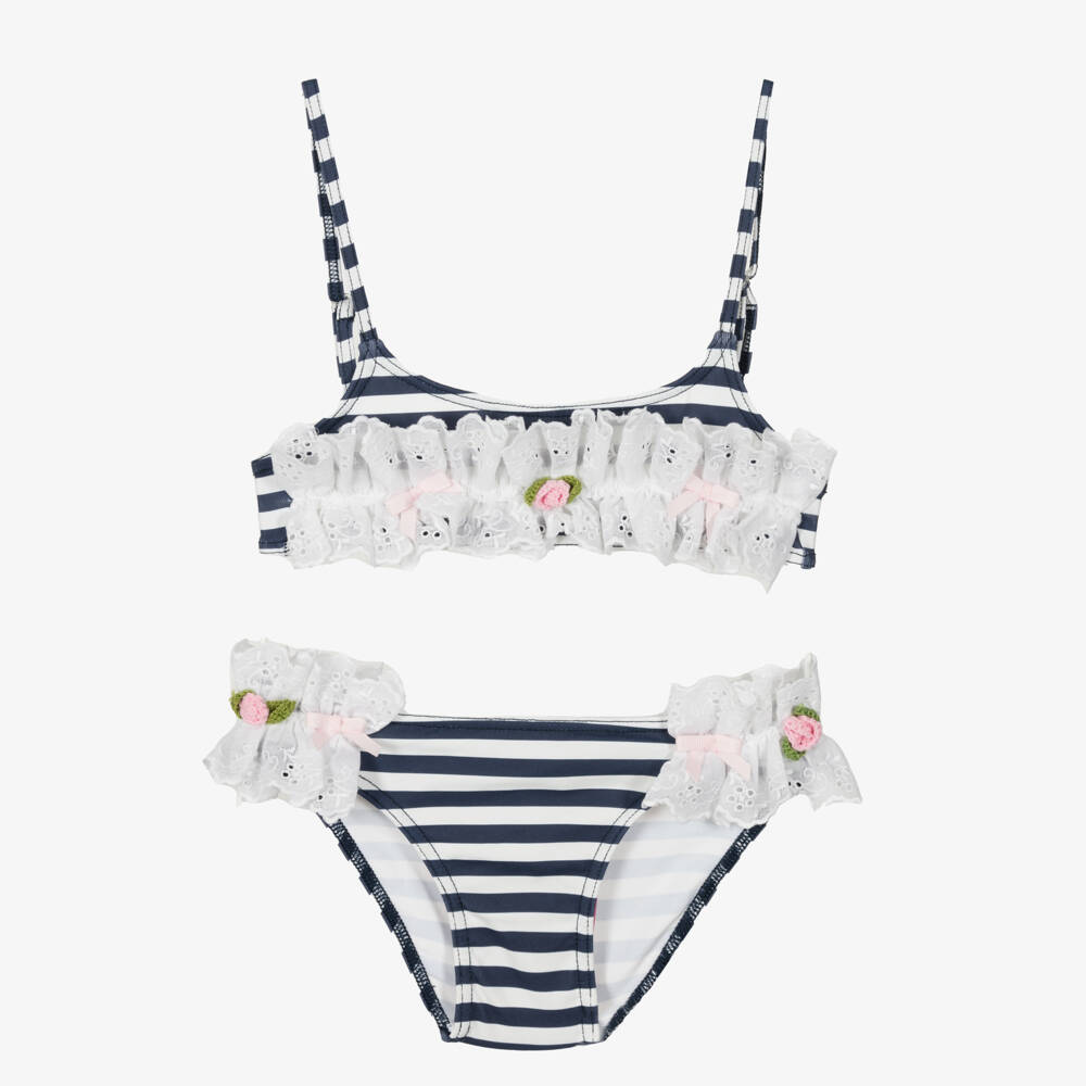 Lovely navy blue and white striped bikini for girls by Selini Action. Delicately hand-finished, the top has a beautiful white broderie anglaise trim ruffled across the front, with little pink bows and a cute knitted flower to match the bottoms. Silky smooth and stretchy, both have linings on the front side for extra comfort. The top has an easy clasp fastening on the back and adjustable straps for a good fit.