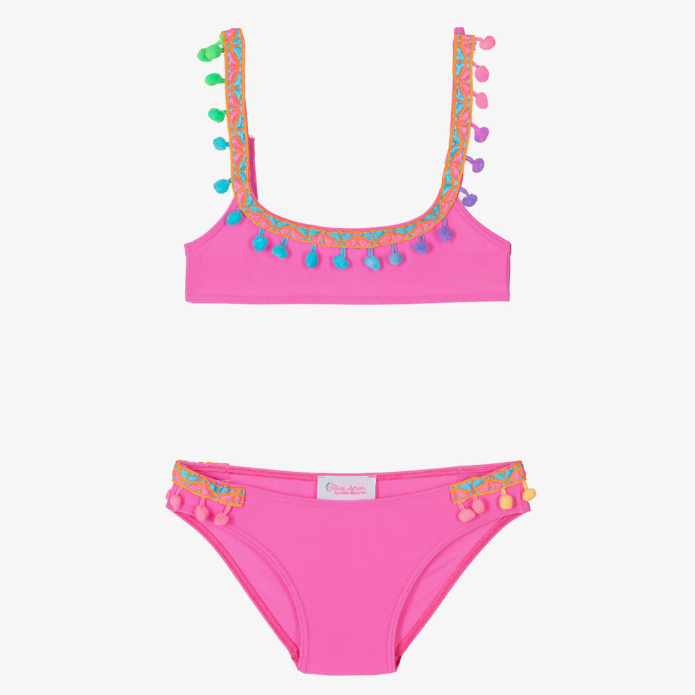 A handmade bikini in fuchsia pink for girls by Selini Action, made in beautifully soft, stretchy fabric. Lined on the front, this fun two-piece is trimmed with fabulous embroidered ribbons and multicoloured pom-poms. The bikini top has adjustable shoulder straps and a resin clip on the back. Designed for comfort, the bottoms have an easy-dressing elasticated waist.