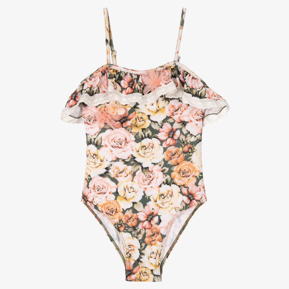 Pretty green and pink handmade swimsuit for girls by luxury brand Selini Action, with a vintage rose print. It has a ruffle around the top trimmed in white lace with a pink tulle floral appliqué. The swimsuit has coordinating floral appliqués on the front, useful, adjustable shoulder straps and a front lining for comfort.