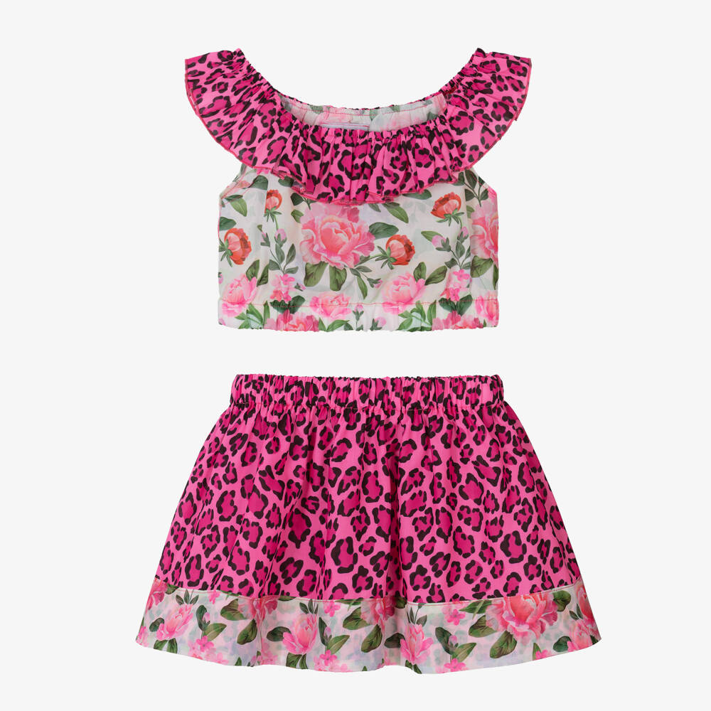 Girls Pink Leopard & Rose Skirt Set