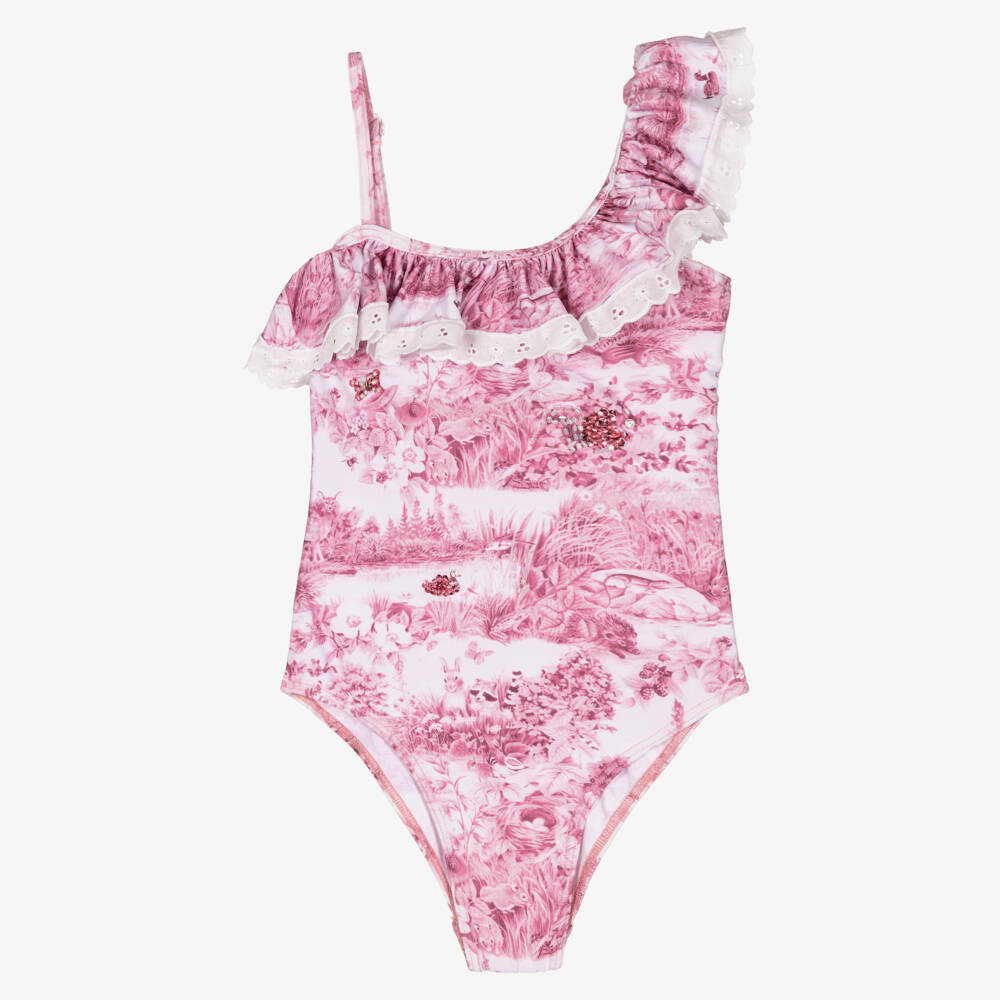 Gorgeous silky soft pink and white swimsuit for girls by luxury brand Selini Action, made by hand. It has a lovely woodland-inspired Toile de Jouy print, embellished with shimmering sequins and beads on the front. It has a broderie anglaise frill on the over-the-shoulder ruffle, and a useful, adjustable strap on one side.