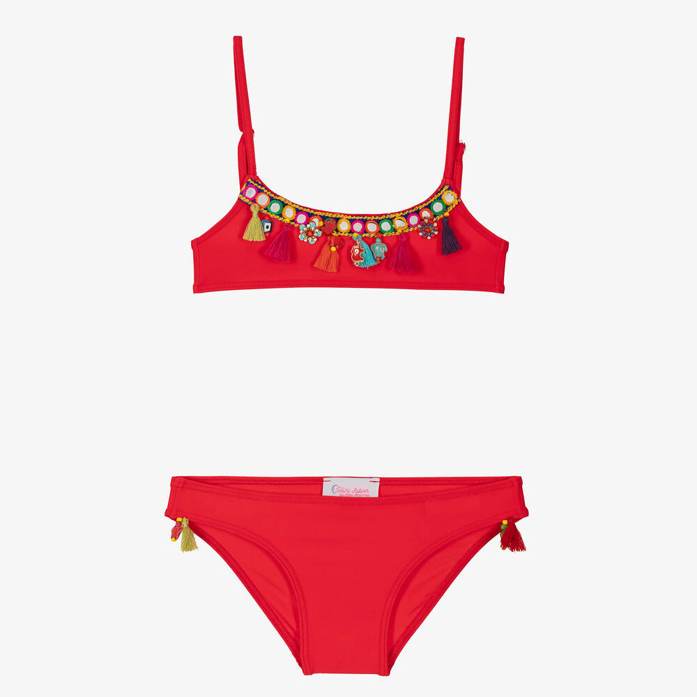 Selini Action designs this fabulous red bikini for girls, handmade in silky and stretchy fabric. With adjustable shoulder straps and an easy-fastening clip on the back, the bikini top has tassels, mirrored discs bordered by embroidery, and a fun mix of bohemian beads in a rainbow of colours. The matching bottoms have tassels and elephant-shaped charms on the sides for a coordinated look.