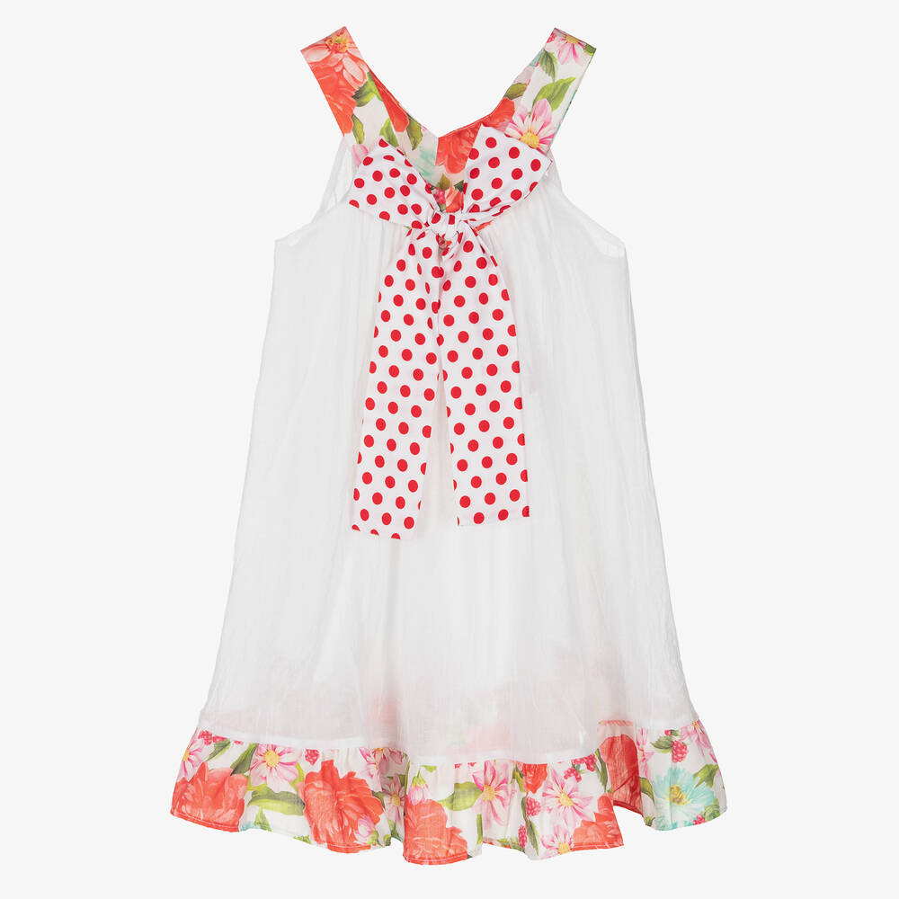 Lovely handmade white beach dress for girls by Selini Action. Made in sheer cheesecloth, it has floral poplin shoulder straps and a matching ruffle around the hemline. There is a large, fixed red polka dot bow on the front.
