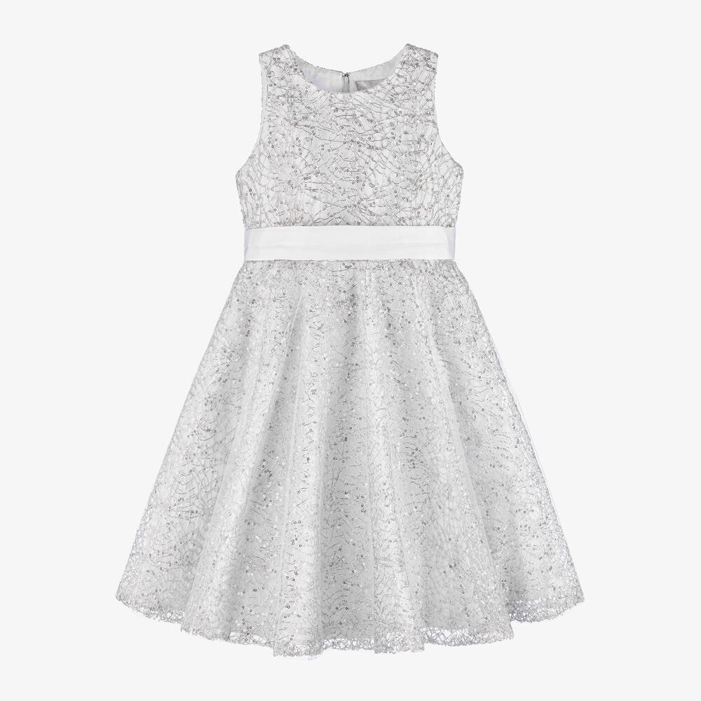 Beautifully opulent white and silver dress for girls by Sevva, ideal for special occasions. Encapsulated by a fine layer of soft tulle, this stunning dress has a layer of sparkling silver embroidery with intertwined silver sequins. The hidden layers of satin and structured tulle give this style a voluminous silhouette. Lined in silky fabric for comfort against the skin, it fastens with a concealed zip on the back. A removable white satin sash belt ties into a romantic bow on the back to complete the look.