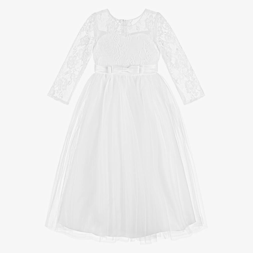 An elegant white dress for girls by British brand Sevva, ideal for a special occasion. This stylish floor-length gown has a luxurious satin underlayer with a shaped bodice. The bodice and long sleeves have a delicate floral lace overlay and the waist is beautifully defined by a white satin band with a decorative bow at the front and a sash tie at the back. The skirt is finished with layers of gathered tulle and the dress fastens neatly with a concealed zip.
