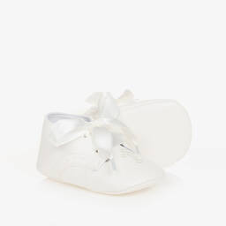 Suitable for baby boys and girls, an ivory pair of pre-walker shoes by Sevva, with embroidered religious symbols on the front. Made in soft faux leather, with a fabric lining for comfort. These special occasion shoes secure with sweet satin ribbons on the front, for a snug fit.