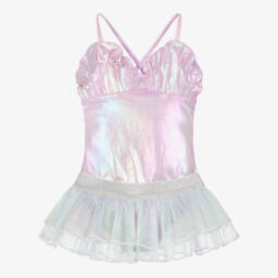 Blue and white tankini for girls by Shade Critters, patterned in a beautiful seashell and floral print. This stylish two-piece is made in silky smooth and stretchy fabric with UPF50+. The long-sleeved top fastens with an exposed zip on the back, and the fully lined bikini bottoms have a pretty ruffle with white bobble trim.