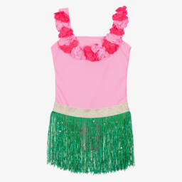A lovely pink swimsuit for girls by Shade Critters, with UPF50+. Silky smooth and stretchy, it is decorated with gorgeous fabric flowers around the neckline and shoulders. Fully lined for comfort, this stylish one-piece comes with a beautiful white crochet lace sarong to cover-up at the beach or poolside.