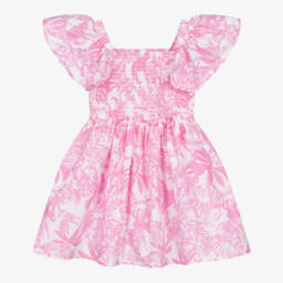 White and pink cotton dress for girls by Shade Critters, beautifully patterned with seashells and florals. Ideal for warmer days, this soft and lightweight dress has a comfortable, shirred bodice and pretty flutter sleeves.