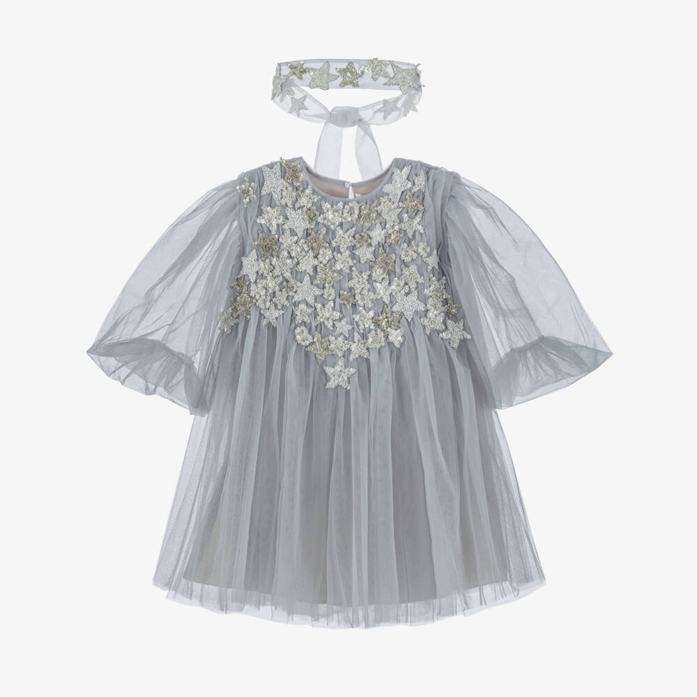 A wonderful grey dress for girls by Shatha Essa, ideal for any special occasion. Crafted from delicate layers of tulle fabric, it features shimmering sequin star appliqués, adding a touch of magic. The dress showcases voluminous sleeves with a flowing silhouette and a single popper fastening on the back. To complete the look, there is a matching headband with stars.