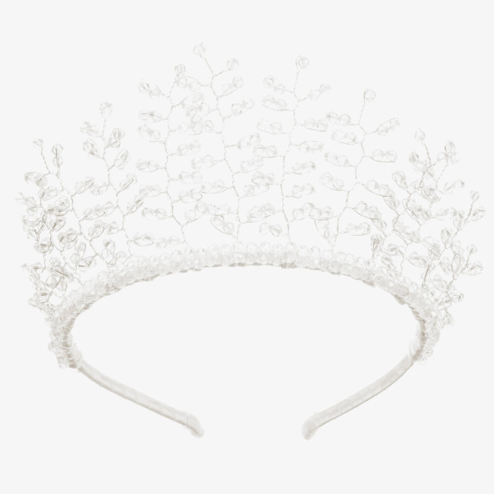 Girls special occasion tiara hairband from Sienna likes to Party. Handmade, the slim metal band is covered in white satin and decorated with finely twisted wire and sparkly crystal beads.