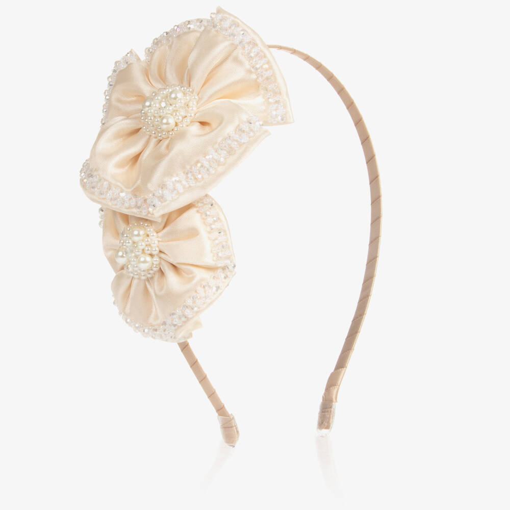 A beautiful warm ivory hairband for girls by Sienna likes to party. The slim, metal band is covered in satin ribbon, topped with vintage-inspired silky flowers, sparkly crystal beads, and faux ivory pearls. This luxury, handmade accessory is the ultimate finishing touch to any special occasion outfit.