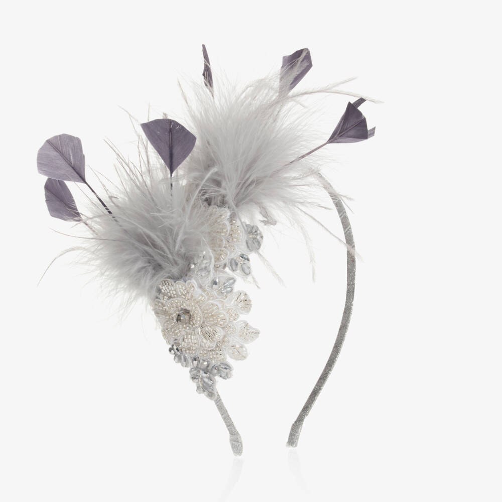 A unique silver hairband for girls by Sienna likes to party, ideal for any special occasion outfit. Decorated with layers of long grey faux feathers, white embroidered flowers and crystal beads, this handmade hair accessory has a glittery silver, ribbon-wrapped metal band for added sparkle.