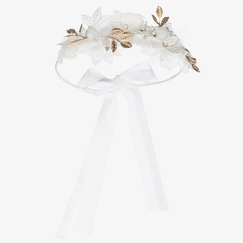 Girls special occasion floral garland hairband by Sienna likes to party. The wire band is covered in white satin and the top is decorated with beautiful lace flowers with beaded centres and gold filigree leaves. There are two organza ribbons to secure the band to the back of the head.