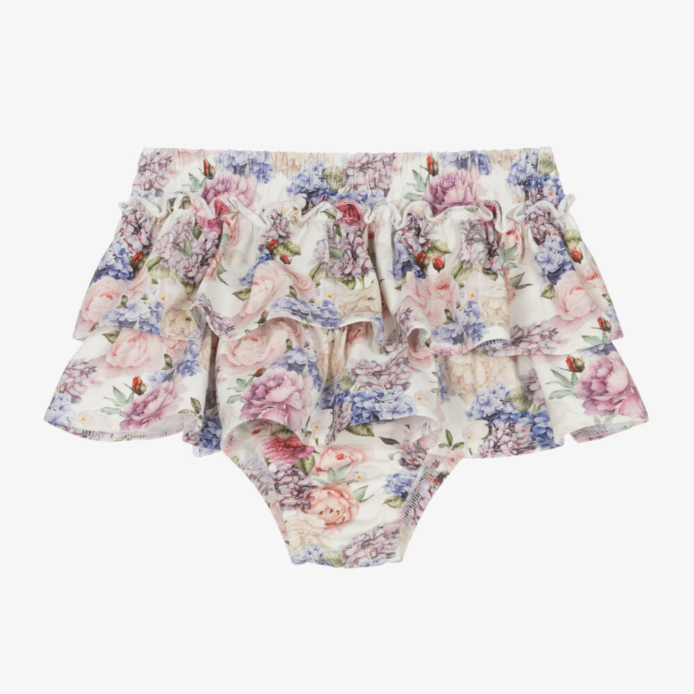 Patterned in a beautiful floral print in pink, blue and green, these ivory frilly pants for baby girls are by Sofija. Made in comfortable cotton jersey, they have pretty ruffle trims and are gently elasticated around the waist and leg openings.
