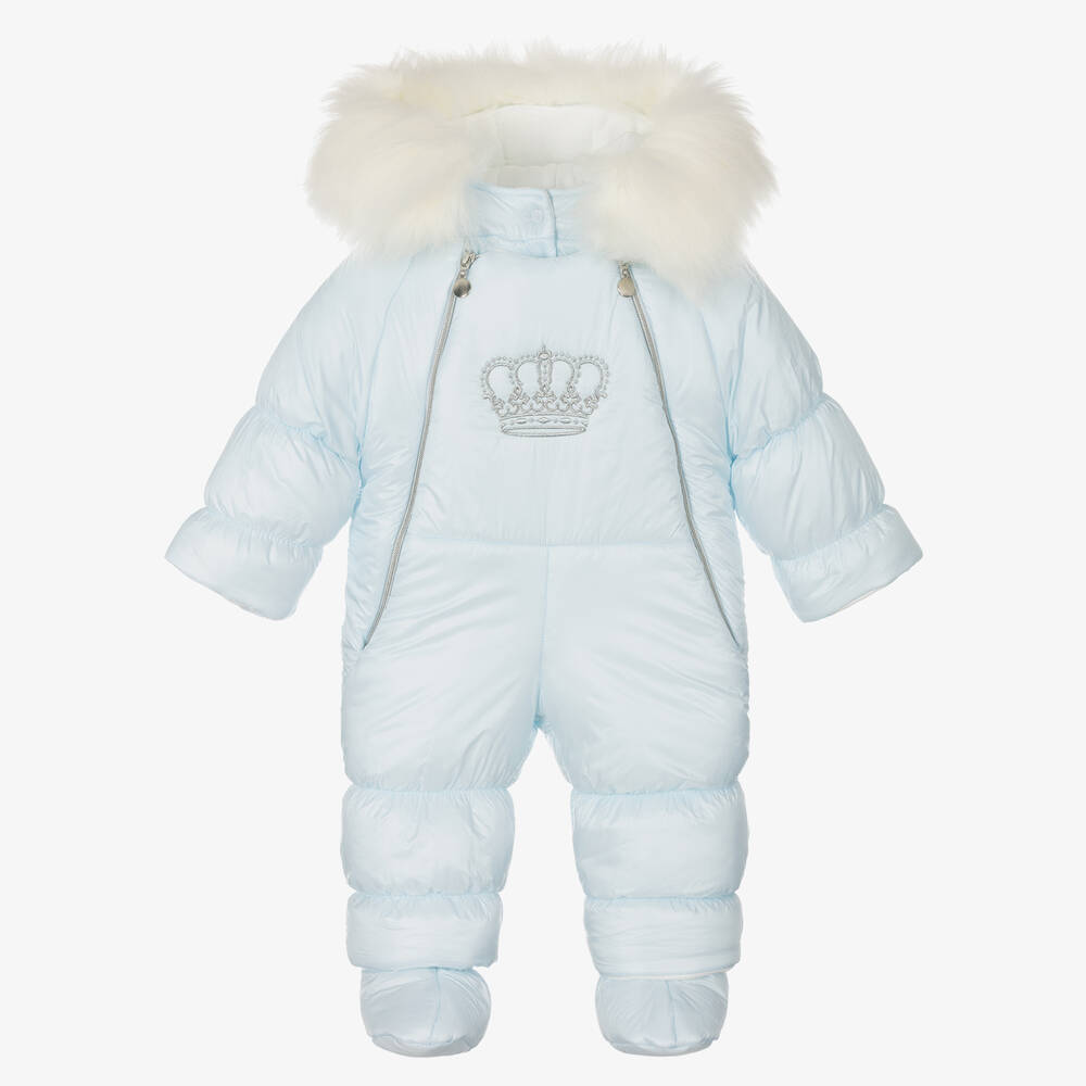 Exclusive to Childrensalon, a silky pale blue snowsuit for baby boys and girls by Polish brand Sofija, with a shiny silver crown embroidered on the front. Warmly padded with a cosy, faux fur-trimmed hood, it is lined in soft, comfortable cotton jersey. The snowsuit has a double front zip closure, a popper-fastening internal panel, cuff inserts and detachable booties for extra cosiness.