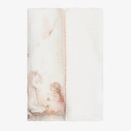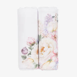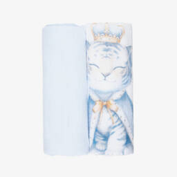 Pack of two muslin cloths for baby boys by Sofija. These practical cloths are made in soft cotton for a gentle feel against delicate skin. One comes in a light blue colourway and the other is stitched with an ornate crest design. Use as a nursing cover, burp cloth, or for mopping up little spills.