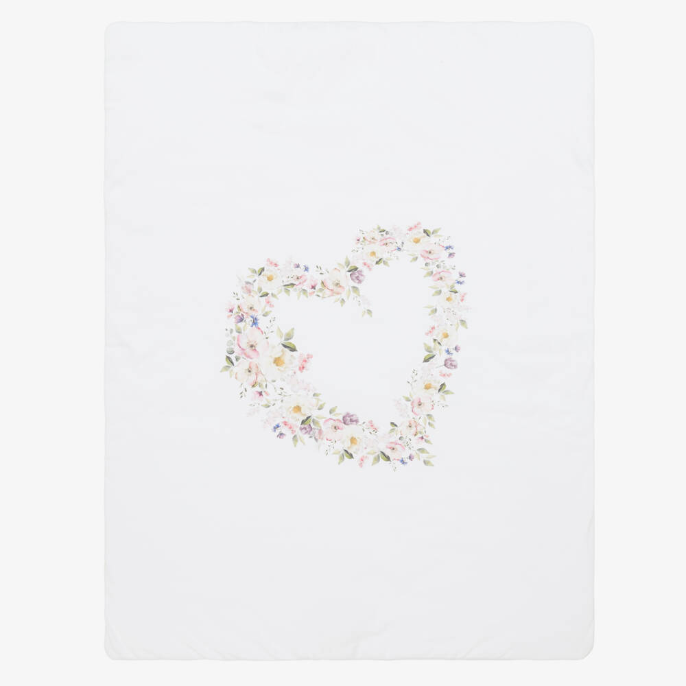 Sofija white blanket for baby girls with a beautiful floral heart print in pinks, purples and greens. Made in soft cotton jersey, and lightly padded, it makes an ideal nursery accessory or a comfortable surface for baby to lie on.
