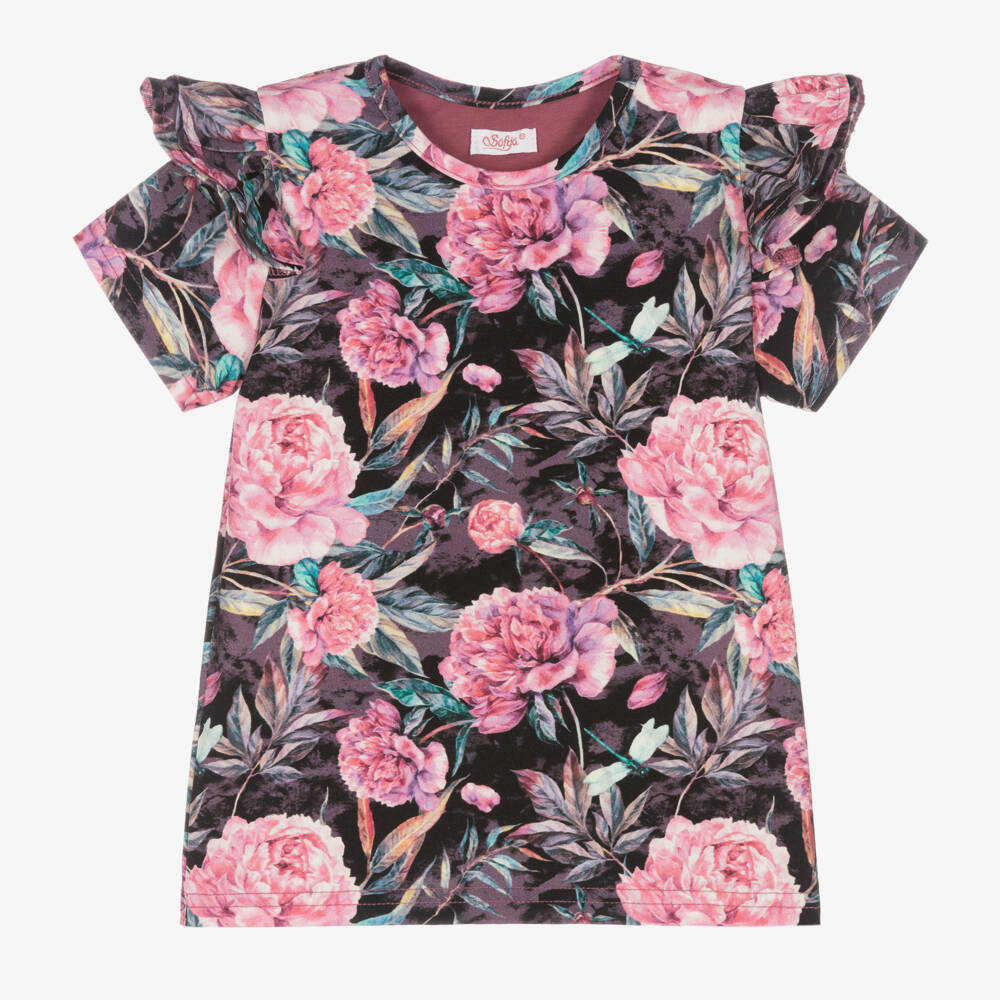 Patterned in a beautiful pink and green floral print, this black T-shirt for girls is by Sofija. Made in comfortable cotton jersey, it is trimmed with pretty ruffles over the shoulders.
