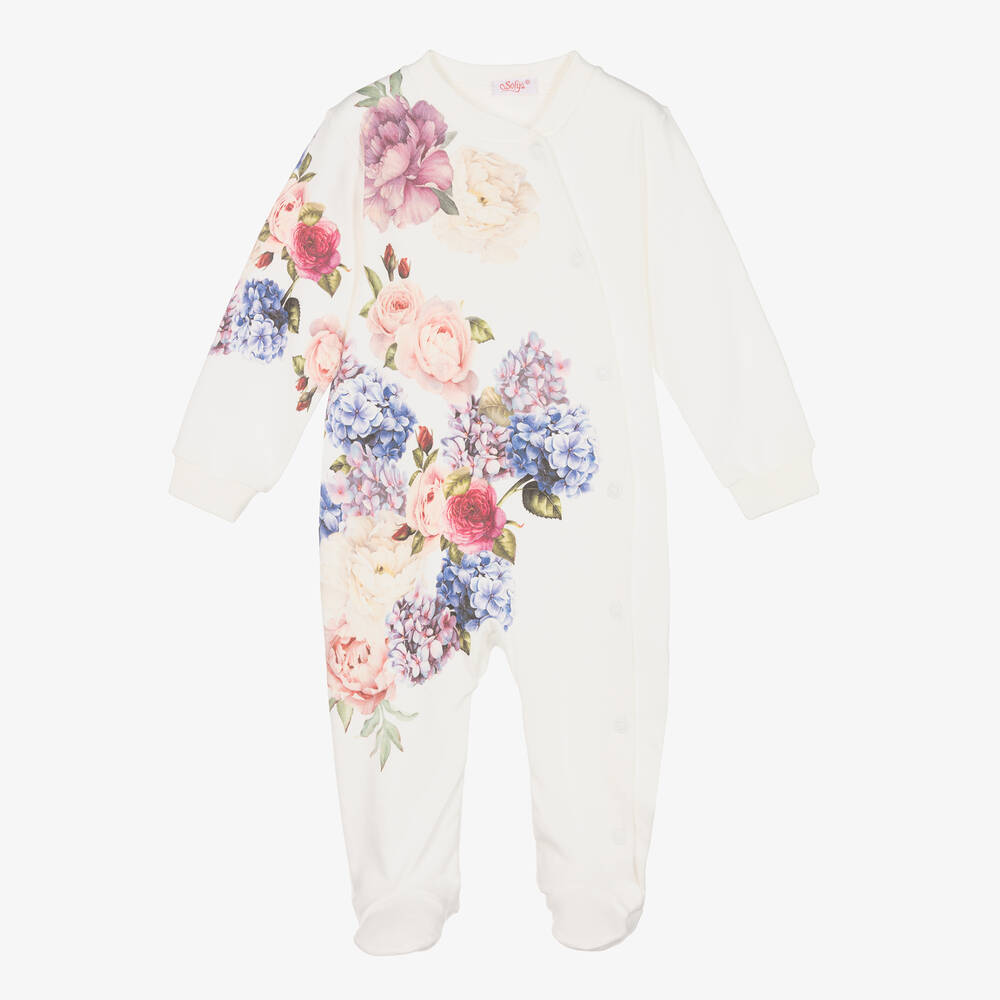 Ivory babygrow for girls by Sofija, with a gorgeous floral print in pink, blue and green. Made in soft and comfortable cotton jersey, it has easy-fastening poppers down one side and between the legs.