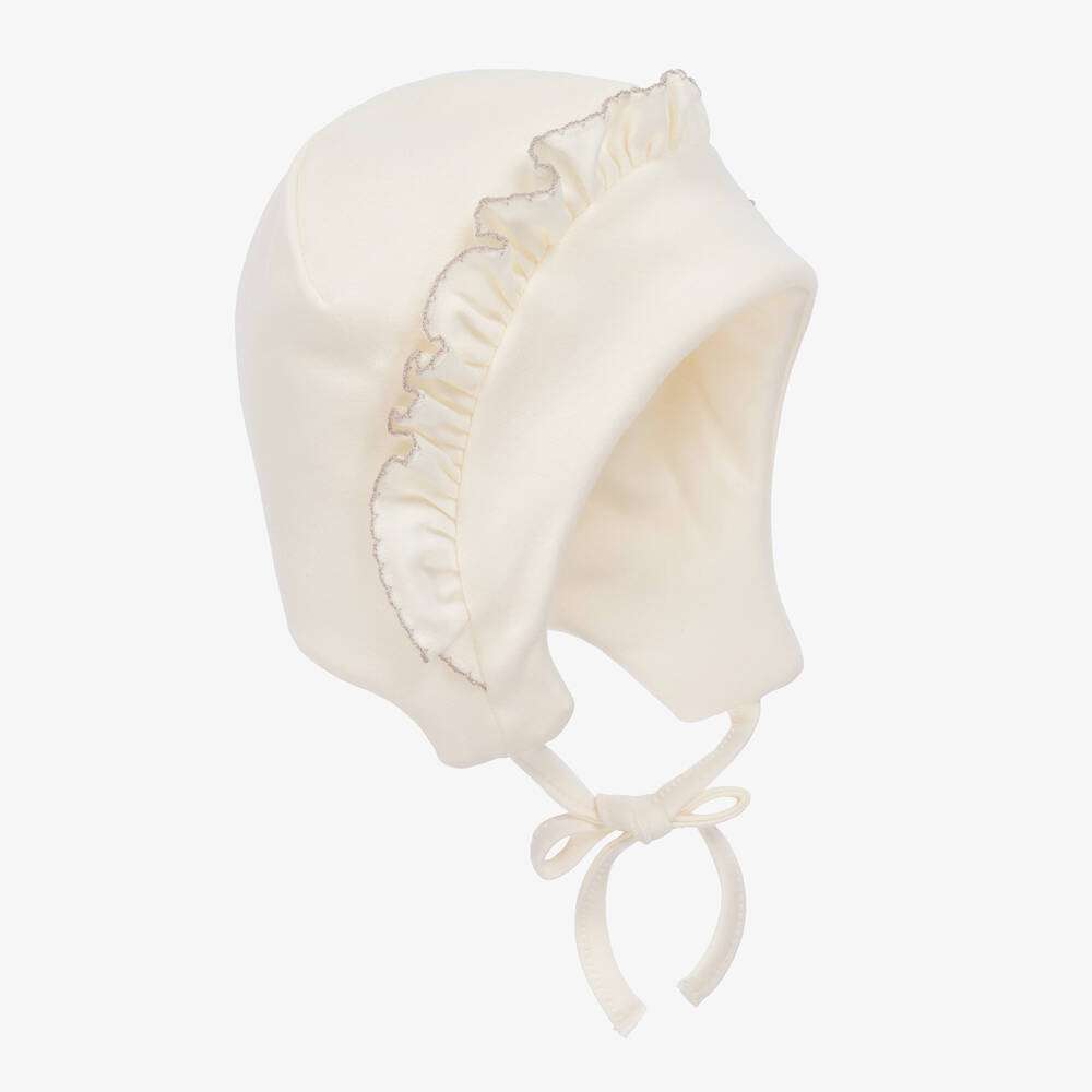 A soft and padded cotton jersey bonnet by Sofija, to keep little heads cosy and warm. It is decorated with a pretty gathered frill and pink rose embroidery with sparkling diamanté, and ties under the chin for a secure fit.