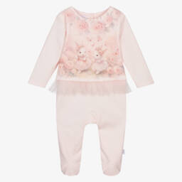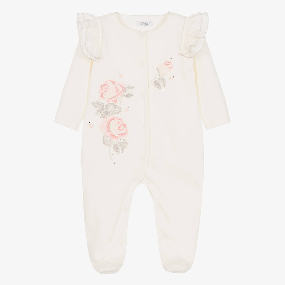 A sweet ivory babygrow for girls by Sofija, decorated with soft pink roses embroidery, diamanté and 2 layers of ruffled trim over the shoulders. Made of super soft cotton jersey, it is both comfortable and easy to wash.