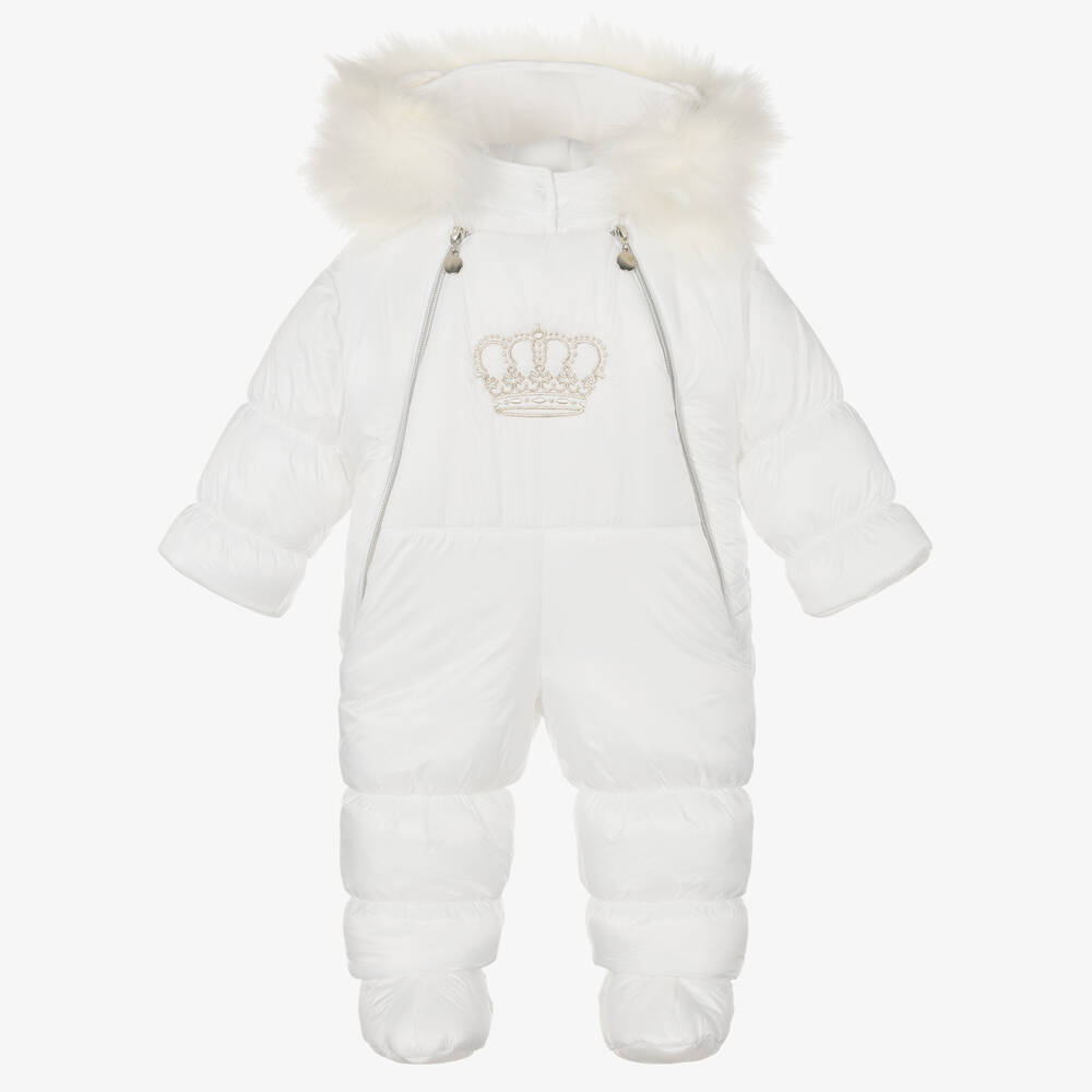 Exclusive to Childrensalon, a silky ivory snowsuit for baby boys and girls by Polish brand Sofija, with a shiny silver crown embroidered on the front. Warmly padded with a cosy, faux fur-trimmed hood, it is lined in soft, comfortable cotton jersey. The snowsuit has a double front zip closure, a popper-fastening internal panel, cuff inserts and detachable booties for extra cosiness.