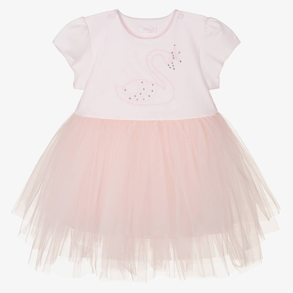 A charming pink cotton jersey dress and tulle skirt for baby girls by Sofija. The soft jersey has a pretty embroidered swan on the chest with diamanté trim and popper fastenings on both shoulders.