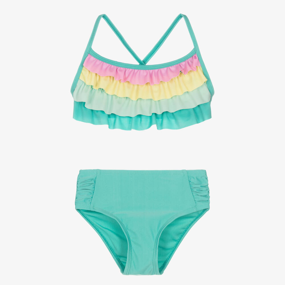 A pretty turquoise blue bikini for girls, by Soli Swim. Made in a silky soft recycled fabric, this bikini is stretchy and has a breathable lining for comfortable wear. Adding beauty to this poolside style, the top has rainbow ruffles, with straps that cross-over at the back. It has UPF50+ to protect the areas that are covered.