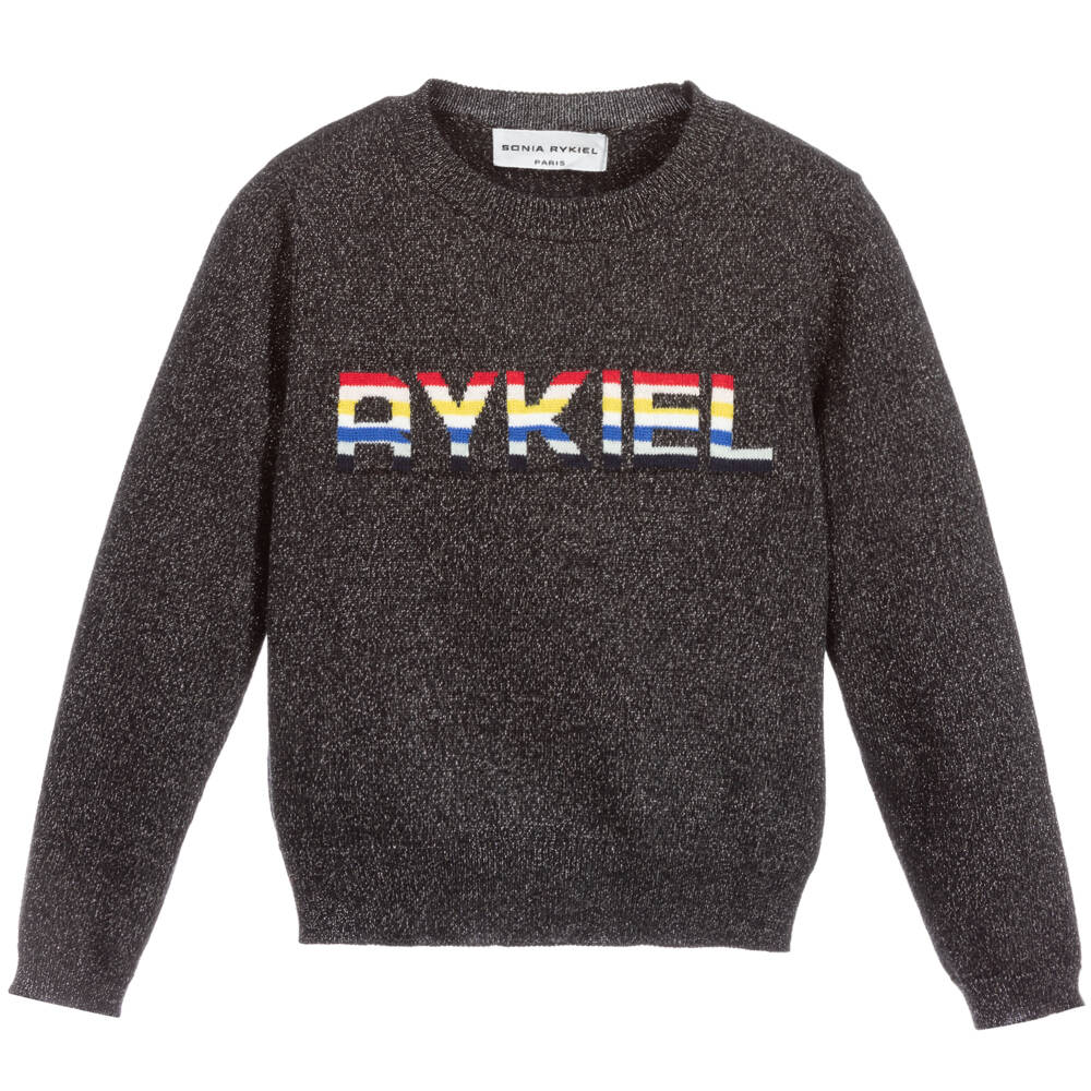 A black and grey marl sweater from Sonia Rykiel Paris. Softly knitted in a wool blend with a sparkly silver thread, it has a colourful jacquard logo on the front.