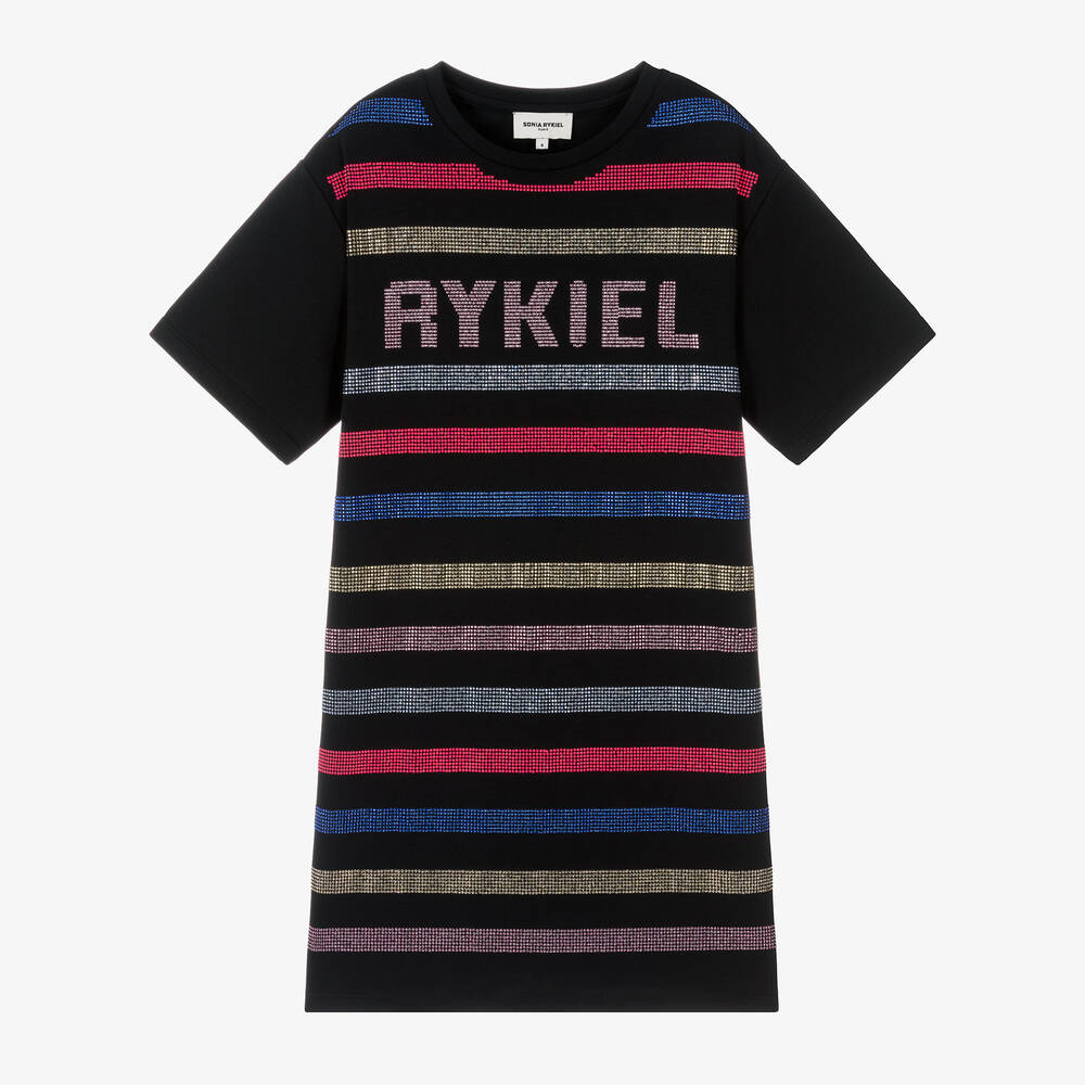 A black Mini-me T-shirt dress for girls by Sonia Rykiel Paris, made in soft cotton jersey. Fit for a party and fun for a casual look, the front is embellished with sparkly stripes and a bold logo in colourful rhinestones.