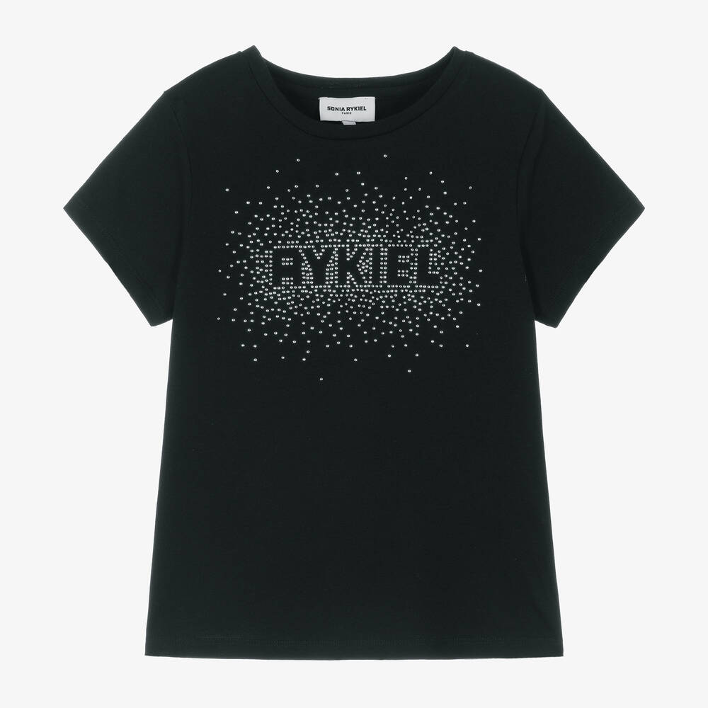 Black T-shirt for girls by Sonia Rykiel Paris, inspired by the adult's collection. Made in comfortable cotton jersey, this short-sleeved top has a beautifully soft feel with a round neckline. The logo design on the front is formed with small, silver diamantés for a sparkly look.