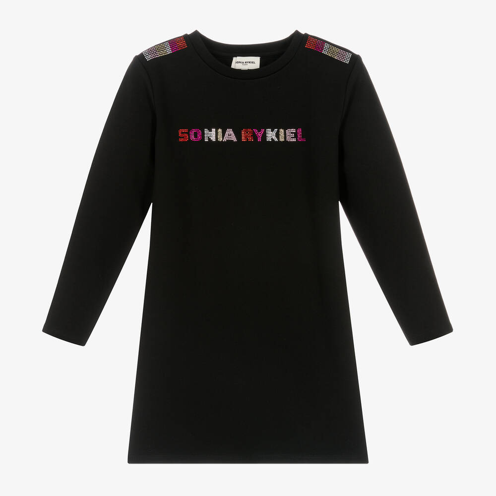 Black dress for girls by Sonia Rykiel Paris, made in soft and mid-weight Milano jersey. This sweatshirt style dress has long sleeves and a round neckline to balance style with comfort. The designer's name can be seen on the front in multicoloured diamantés, matching the sparkly trims on each shoulder.