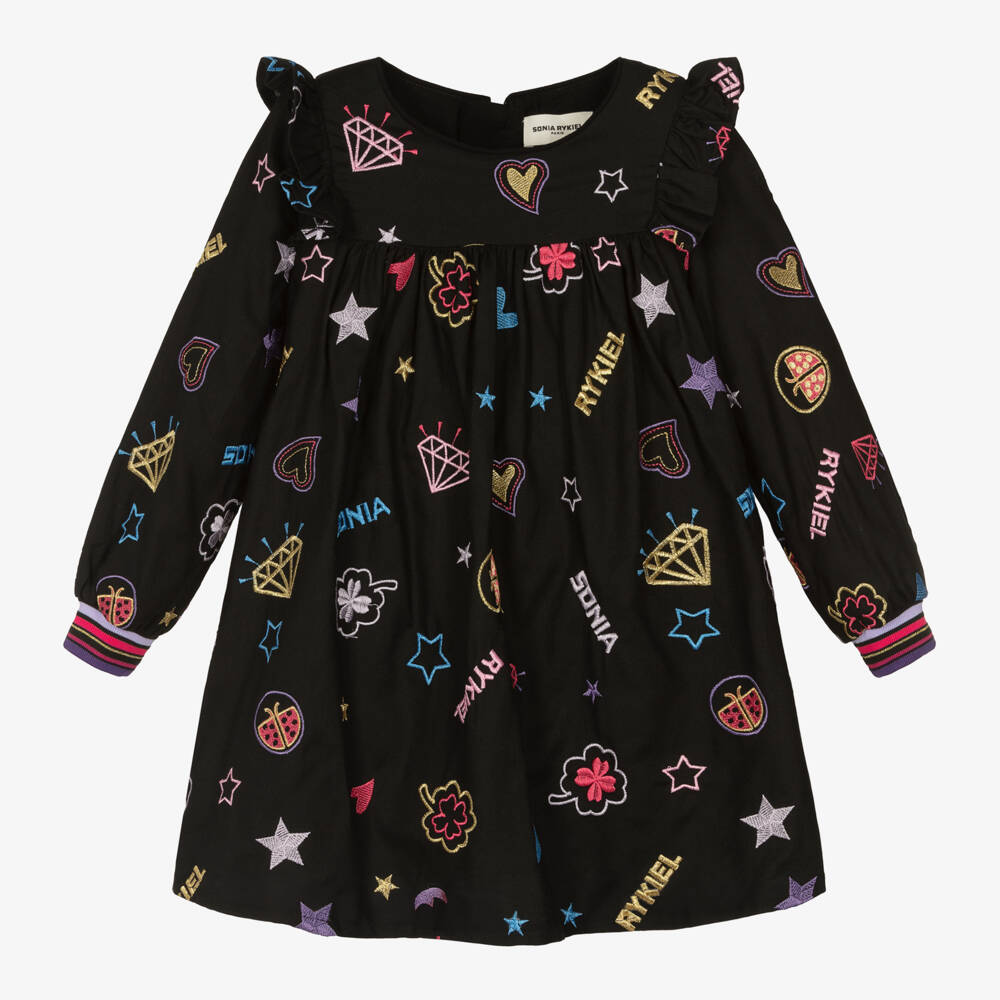 A fun black dress for girls by Sonia Rykiel Paris, made from lightweight cotton twill. Adding a modern twist to a casual style, this dress is embroidered in colourful jewels, charms and logos with specks of glittery gold thread. There are ruffled trims on the shoulders and stretchy striped cuffs. A concealed zip fastening and silky smooth viscose lining complete this look.