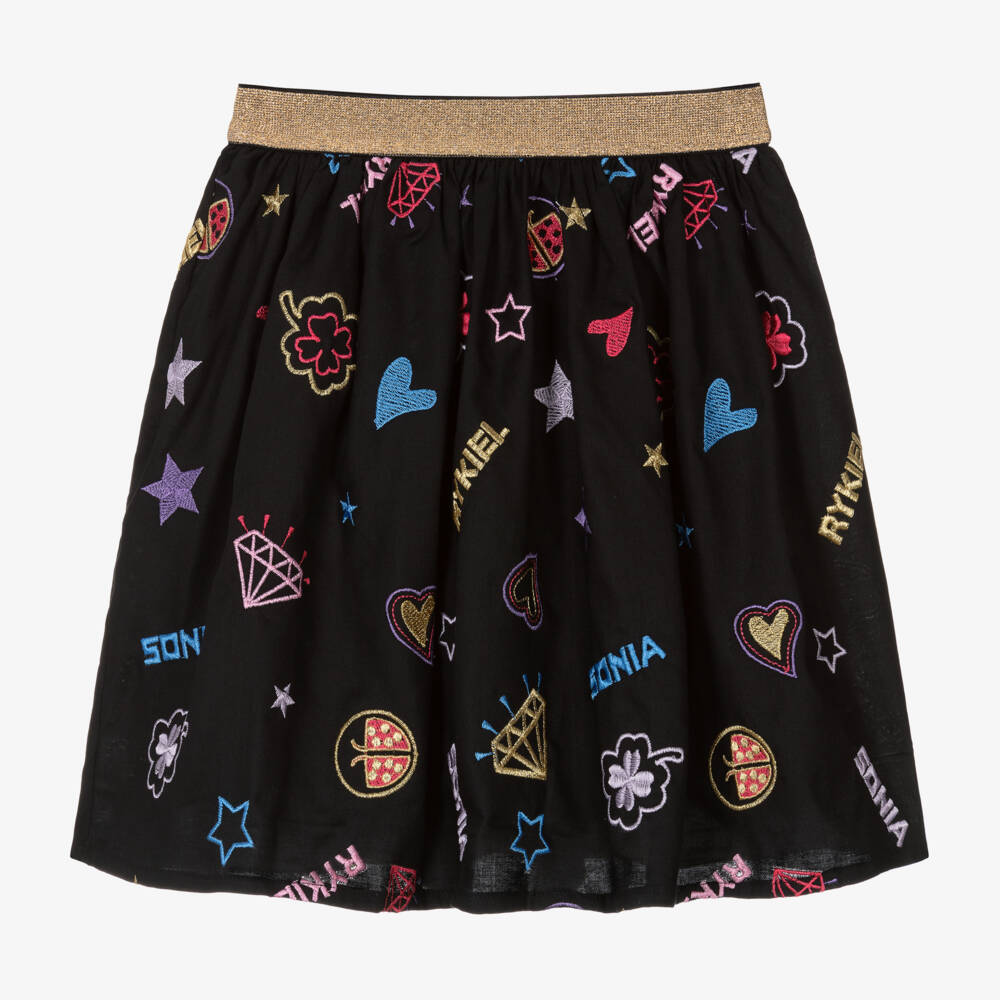 A fun black skirt for girls by Sonia Rykiel Paris, made in soft cotton twill. Great for parties and casual wear alike, this knee length skirt is embroidered with colourful jewels, charms and logos for an eye-catching look. Combining style and comfort, it has a lightweight viscose lining and a glittery gold, elasticated waist.