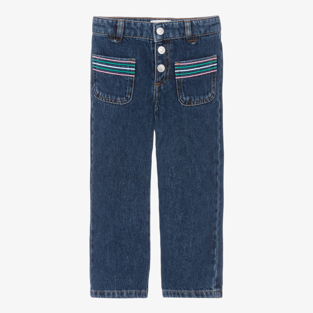 Trendy blue dark-wash jeans for girls by Sonia Rykiel Paris, made from mid-weight, cotton denim. The patch pockets are embroidered with pink and green stripes, and there is a small silver-tone, branded logo tag stitched to one pocket on the back. They fasten in the front with three poppers and have a cool and casual straight leg fit.