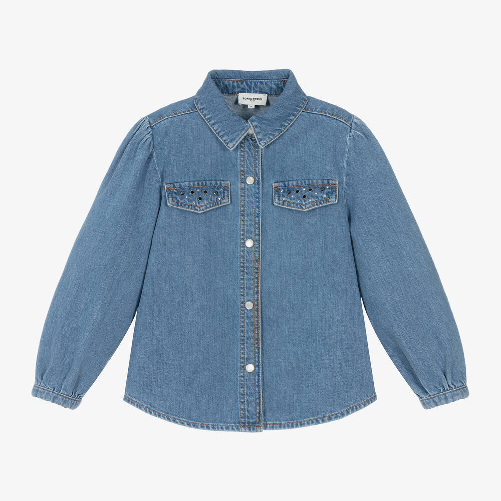 Blue denim shirt for girls by Sonia Rykiel Paris, with an embroidered script logo across the back. Made with cotton for comfort, it is beautifully soft and mid-weight. For a glamorous touch, there are sparkly rhinestones on the faux pocket flaps and the shirt fastens with pearly poppers. It is designed with puffed long sleeves gathered at the cuffs with a popper fastening and the hem is shaped to complete the stylish look.