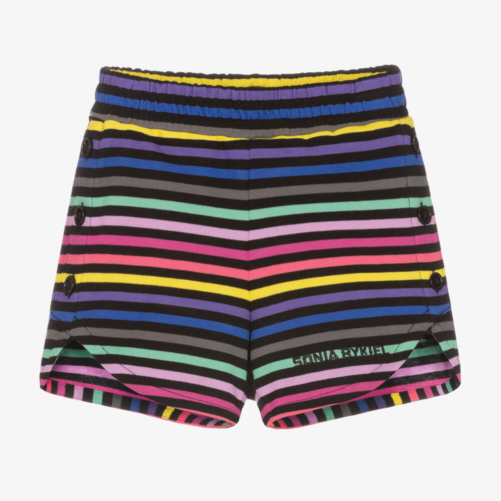 Casual shorts for girls by Sonia Rykiel Paris, made in soft and comfortable cotton jersey, with a bold, colourful striped pattern. Easy to wear, with an elasticated waist, they have faux button fastenings on the sides of the legs for a quirky sports look. They have a sparkly black logo embroidered on one leg for a discreet branded touch.