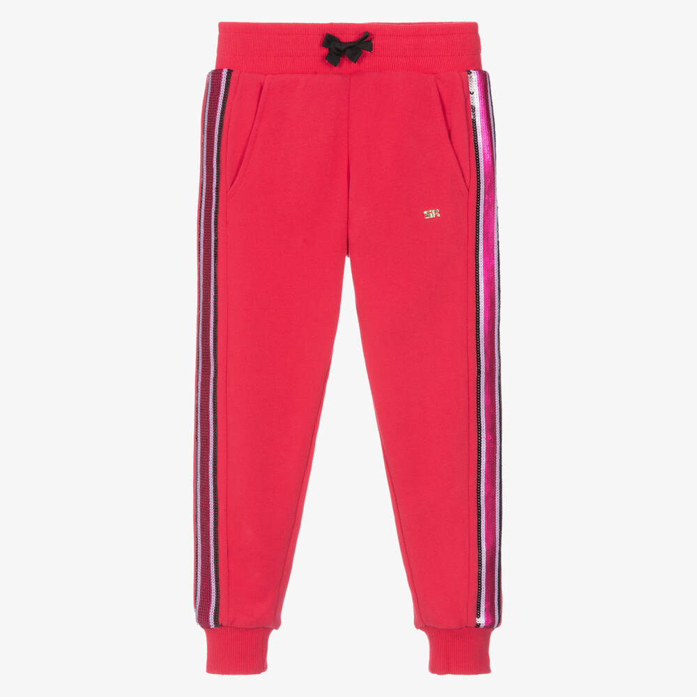 Casual fuchsia pink joggers for girls by Sonia Rykiel Paris are made from soft cotton jersey. They have pretty pink and black sequined stripes down the side of each leg and a gold logo charm stitched on the front. The elasticated drawstring waist ties with a black grosgrain ribbon for a comfortable fit.