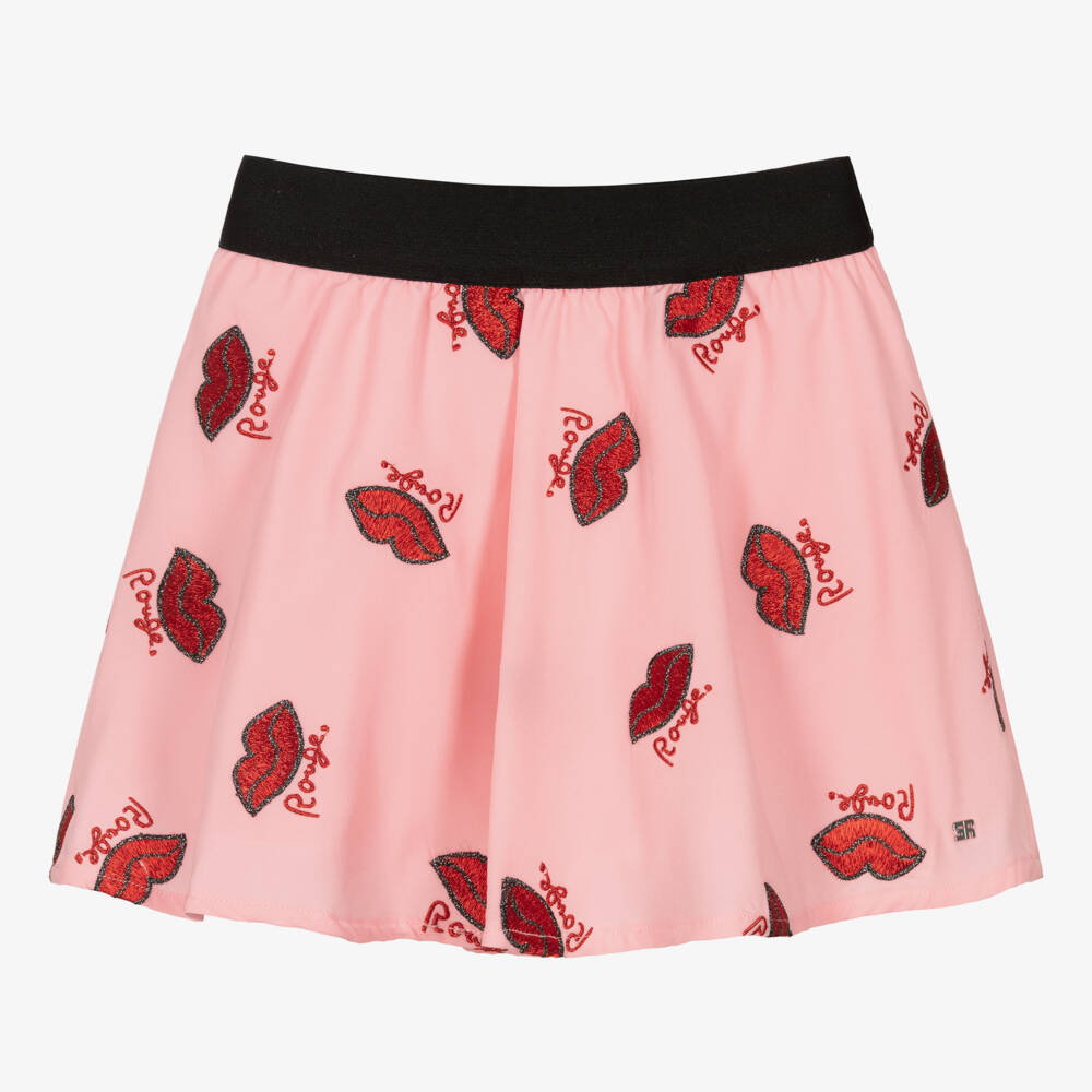 Fun pink skirt for girls by Sonia Rykiel Paris, made in soft lightweight chiffon. Creating an eye-catching statement, it is pattened with red and sprakly black embroidered lips with the word 'Rouge' in red. Fully lined, with an added layer of soft tulle, it has a black elasticated waistband.