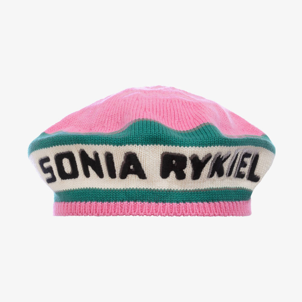 Mini-me pink beret for girls by Sonia Rykiel Paris, knitted in a beautifully soft cotton and wool blend. With signature green and ivory stripes, this winter warmer hat has the designer's name embroidered across the front in black for a bold finish.