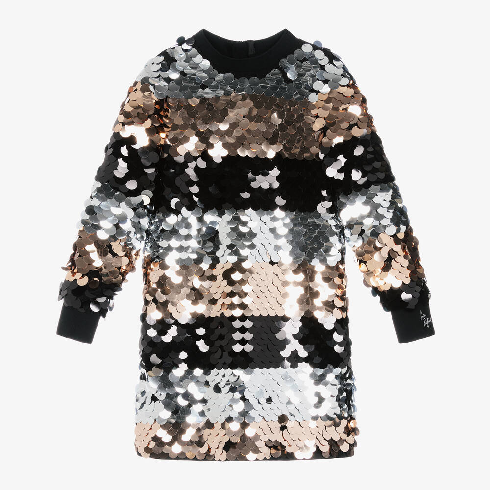 Inspired by the adult collection, this striking party dress for girls is by Sonia Rykiel Paris. Lined with soft viscose fabric, this eye-catching design is striped with black, silver and copper coloured sequins which sparkle beautifully in the light. It has a ribbed neckline and fastens on the back with a zip. The French designer's name can be seen on one ribbed cuffs in metallic silver embroidery.