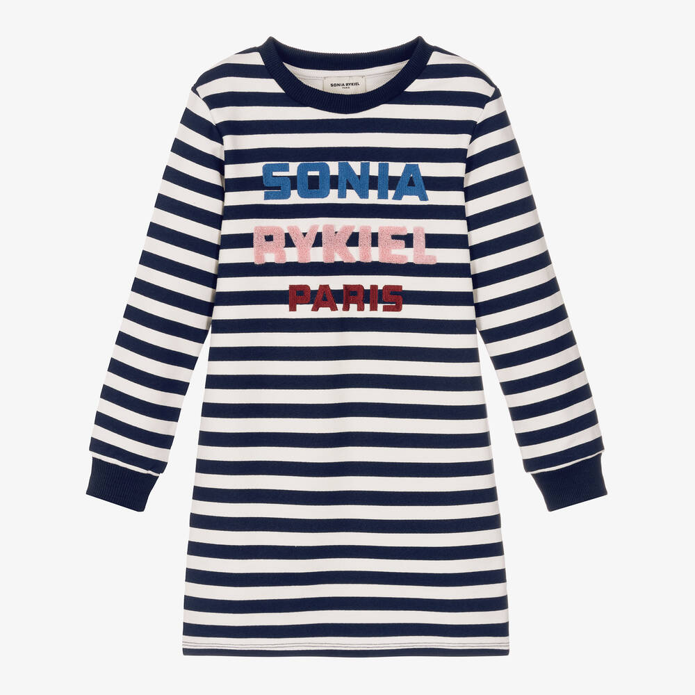 Comfortable cotton jersey dress for girls by Sonia Rykiel Paris, striped in navy blue and white for a stylish, casual Parisian look. As seen in the main collection, this comfortable dress has a gentle A-line shape and navy blue ribbing on the crew neck and cuffs. For instant designer appeal, it features an embroidered and bouclé logo design in blue, pink and red.