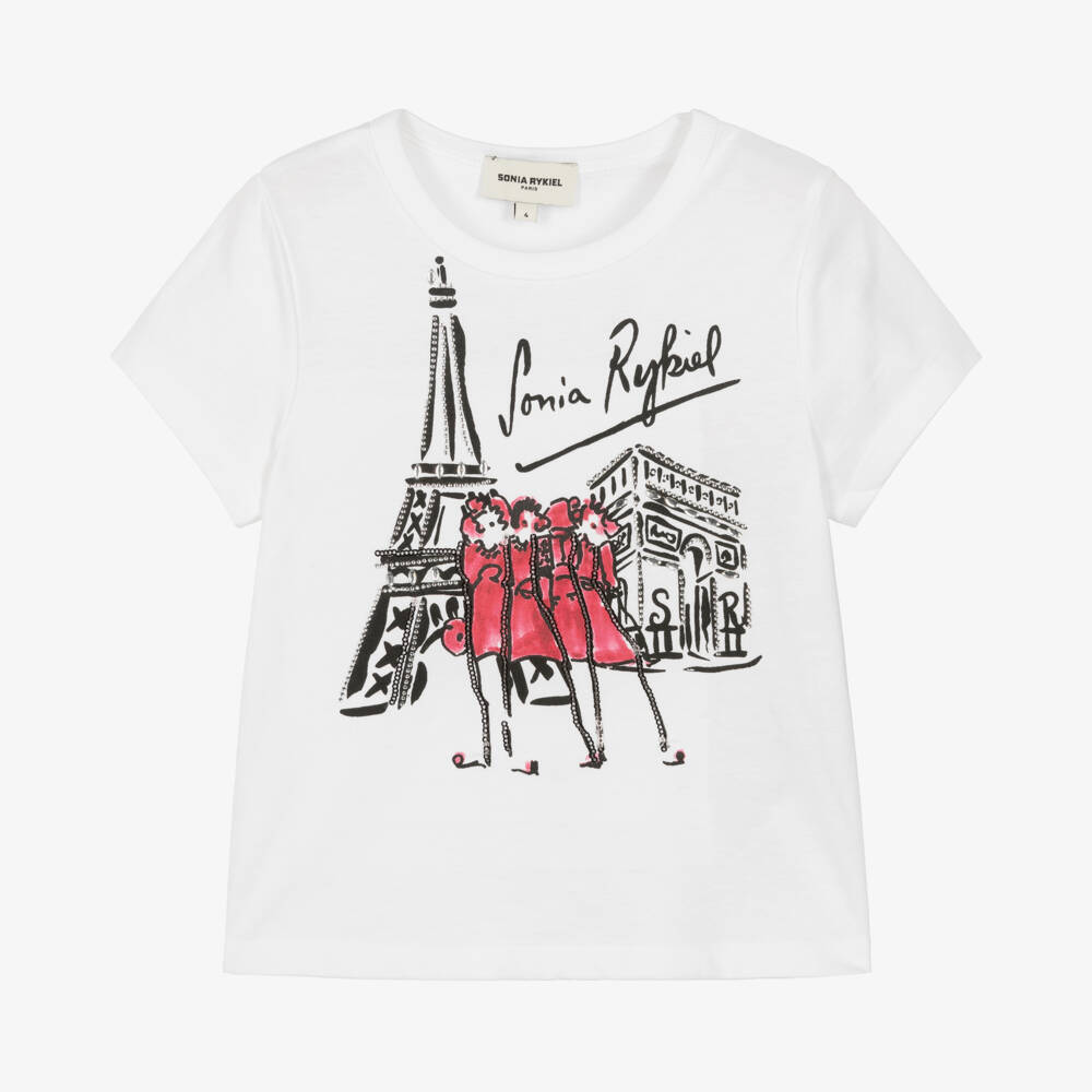 Girls white organic cotton T-shirt by Sonia Rykiel Paris, made from soft jersey for a comfortable wear. This short-sleeved top has a fun black and red Eifel Tower print on the chest, with sequin and diamanté details for added sparkle.