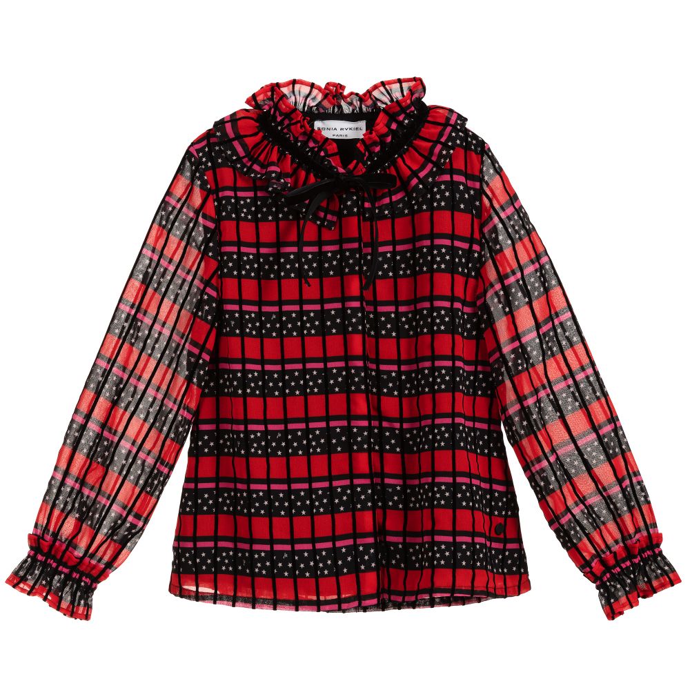 Smart blouse for girls by French designer Sonia Rykiel Paris. Made in sheer chiffon, it has red, pink and black horizontal stripes with little ivory stars, and flocked, black vertical stripes. Fully lined in black cotton, there is a black velvet ribbon around the ruffle collar. The ruffled sleeves are gently elasticated.